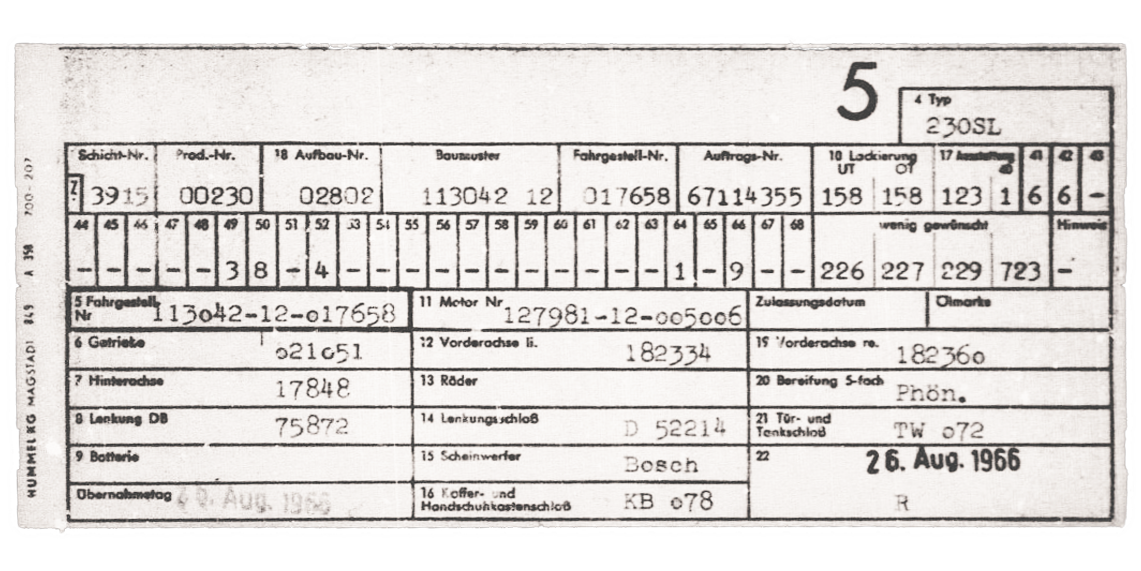 By utilizing the original data card if available or purchasing the original record from Mercedes, we can ascertain the factory-supplied method in which the car was initially sold. Subsequently, we can restore it to factory specifications if desired.